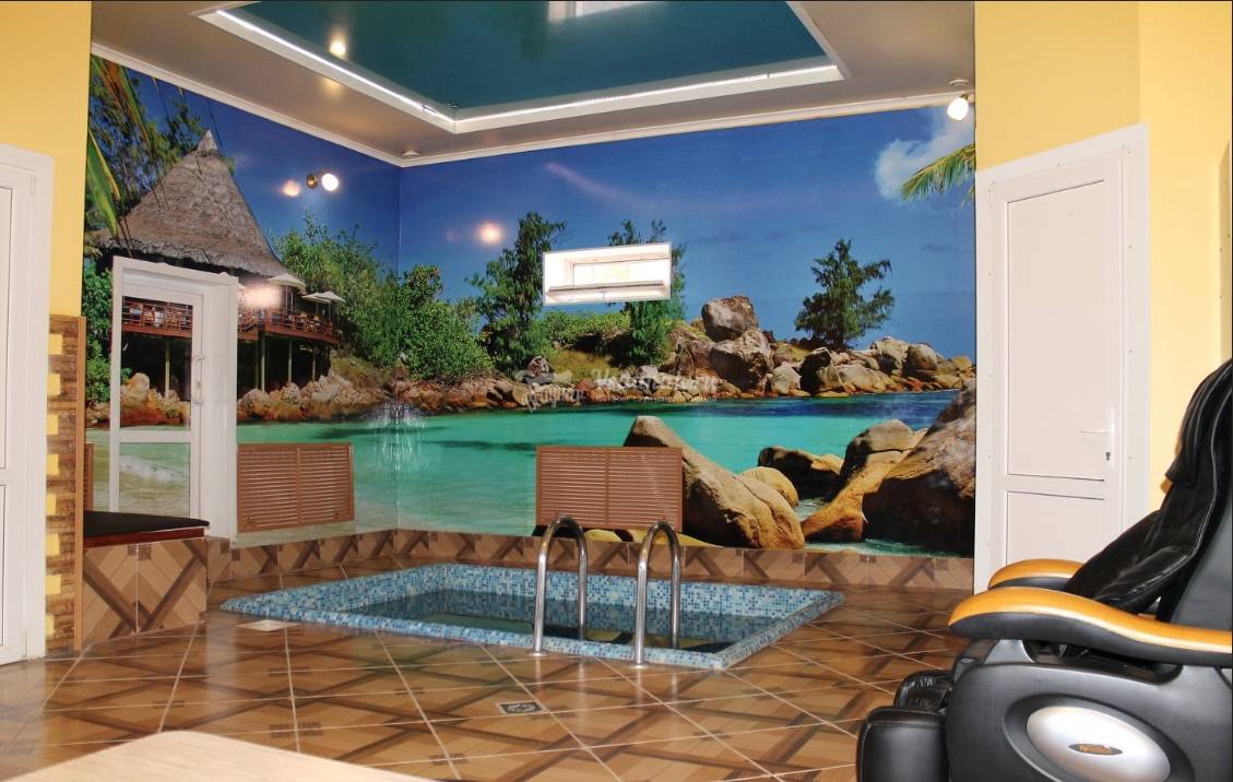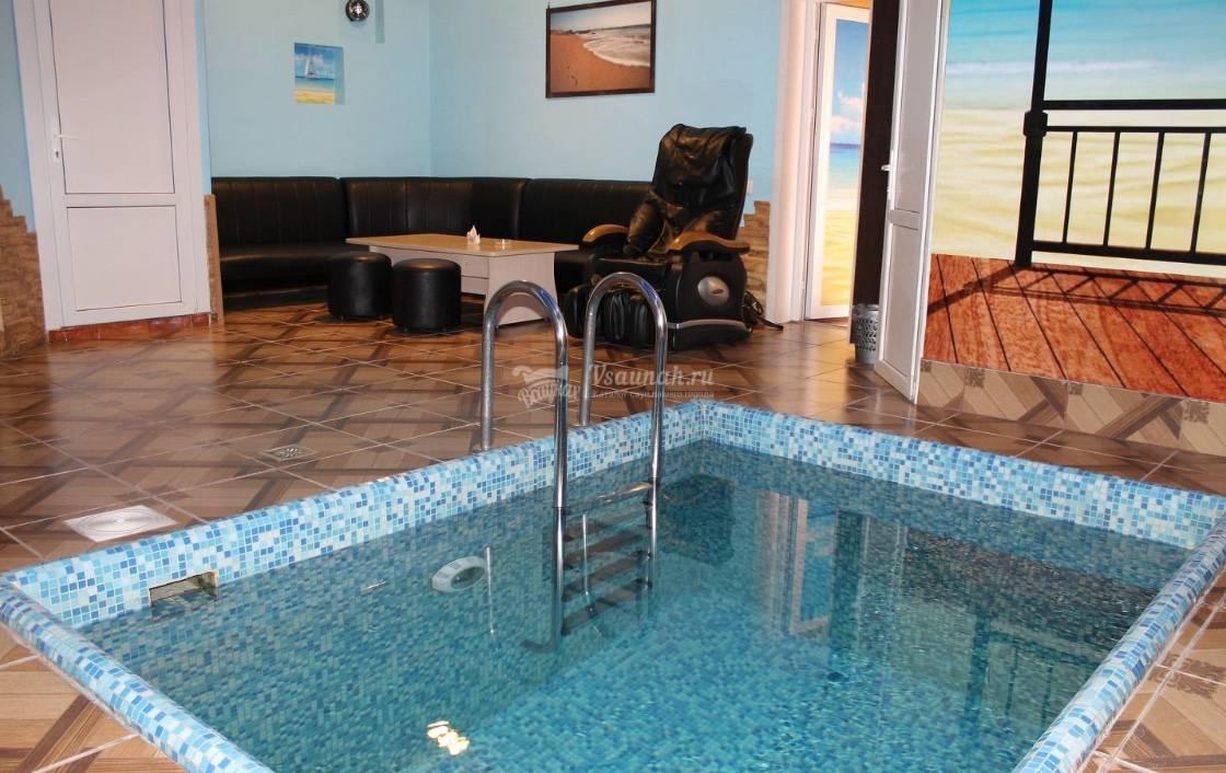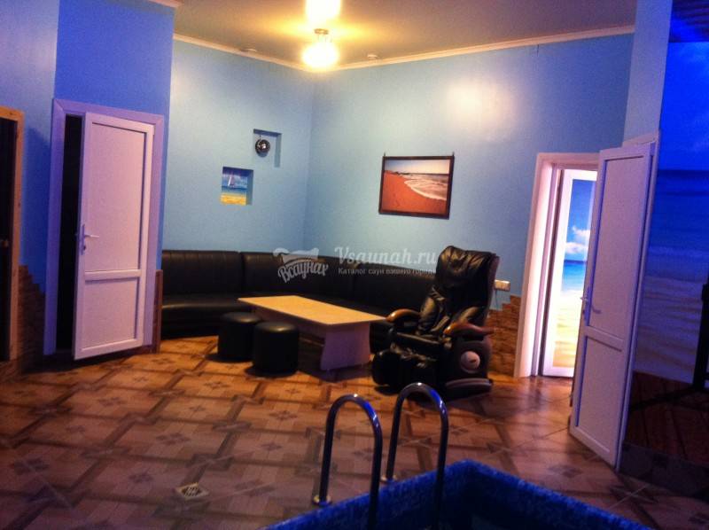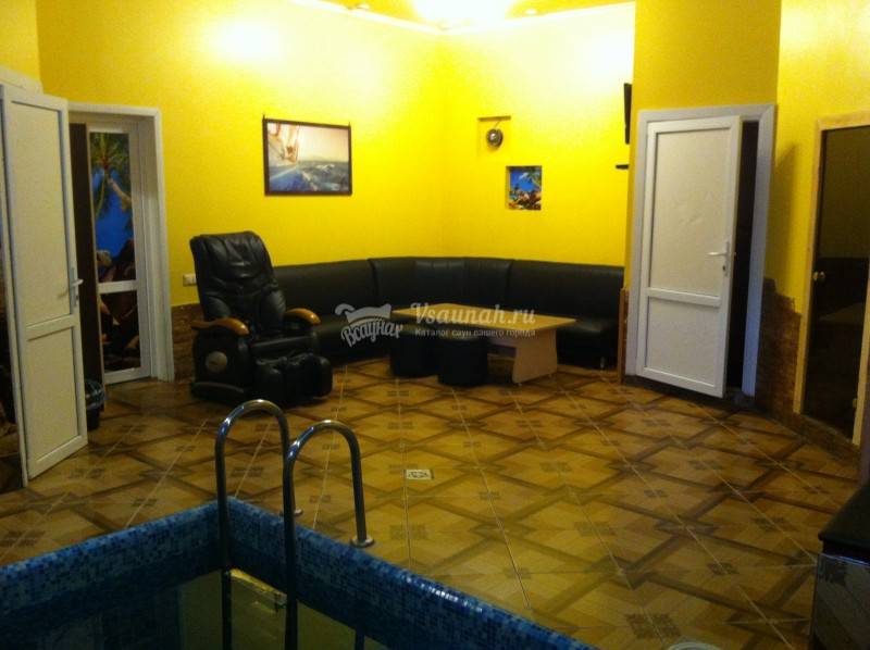 Хорошая сауна. Внутри все чисто. Есть отдельно душ, санузел, парилка, комната для отдыха. Помещение небольшое, но для компании в 8 человек вполне хватило места. В парилку за раз помещается 4 человека, нагревают сильно - пот лил градом. Бассейн небольшой, поплавать не удастся, но вполне глубокий где-то 1,9 м . Есть массажное кресло: 10 рублей и 2 минуты расслабляющего вибромассажа. Единственный минус - шкаф для вещей маленький, поэтому всю верхнюю одежду пришлось складывть на кровать в комнате отдыха.